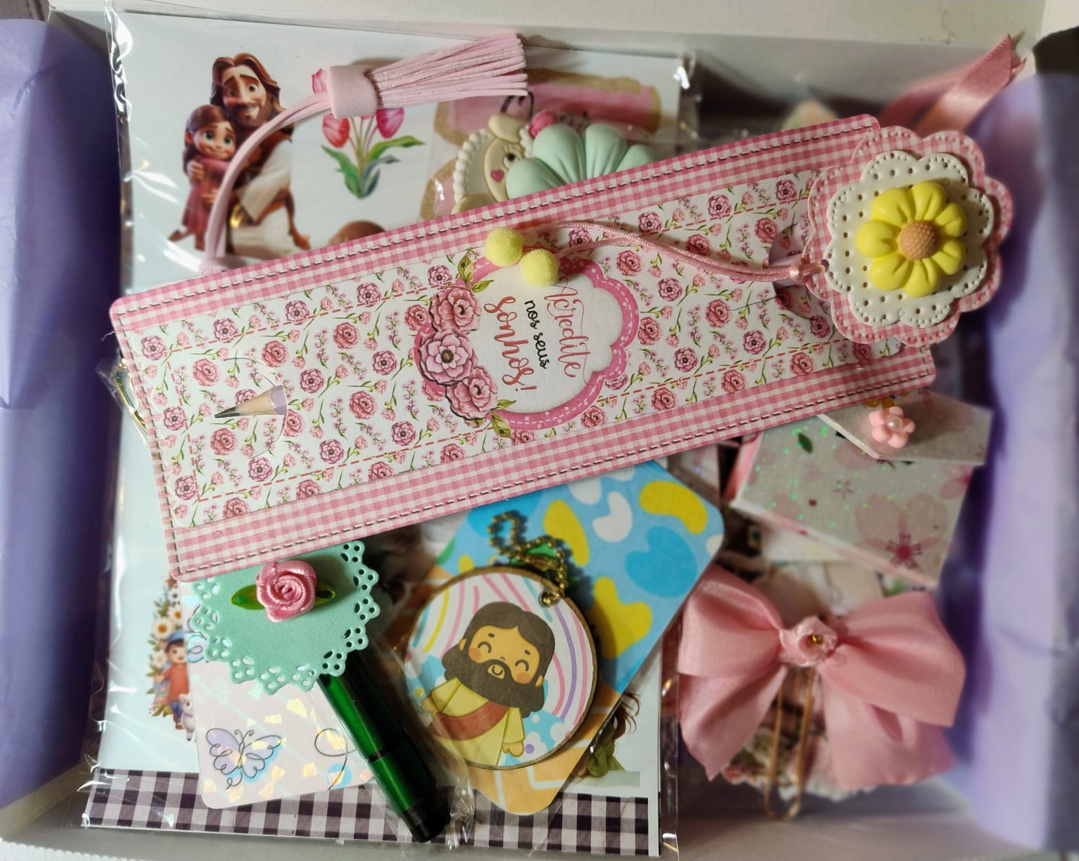- Papelaria fofa diversa (cards com frases motivacionais e bíblicas, marca página, cartelas de adesivos, recortes de ilustrações para Scrapbook)